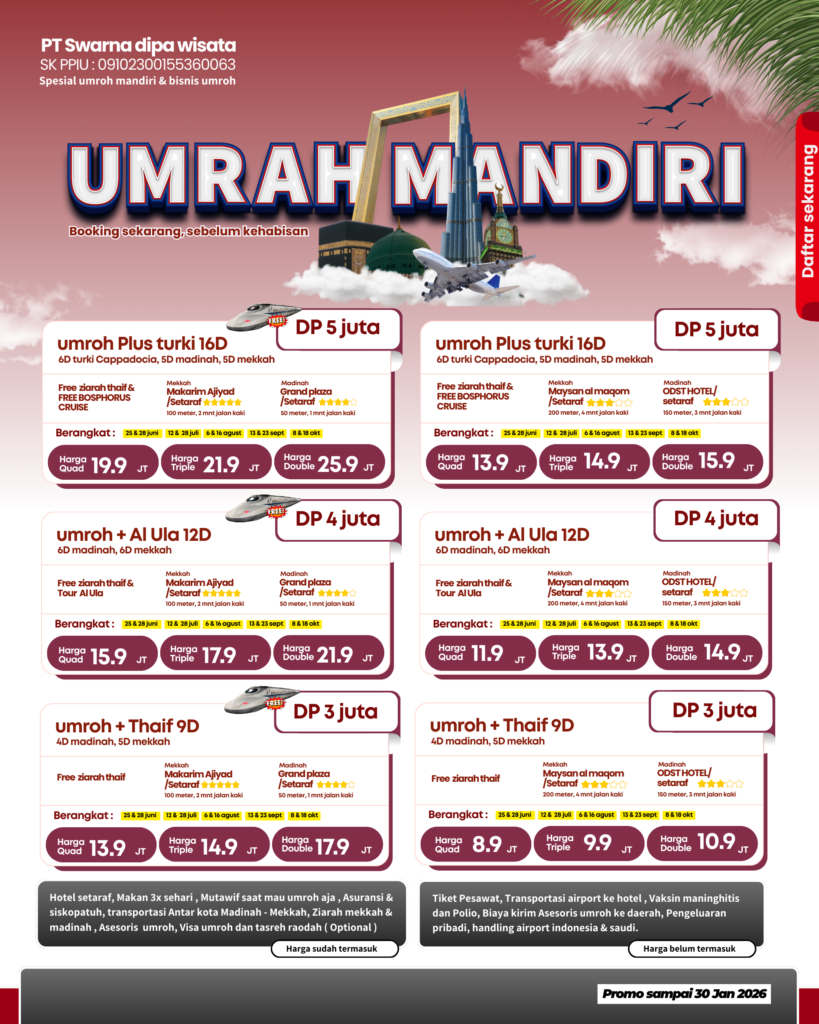 Umroh Mandiri merupakan suatu program untuk membantu kamu agar bisa umroh dengan budget terbatas, namun tetap bisa beribadah dengan nyaman. Cukup cari dan beli tiket pesawat susuai tanggal keinginanmu dan sisa nya serahkan sama Rihlah Imani, untuk membantu mu!